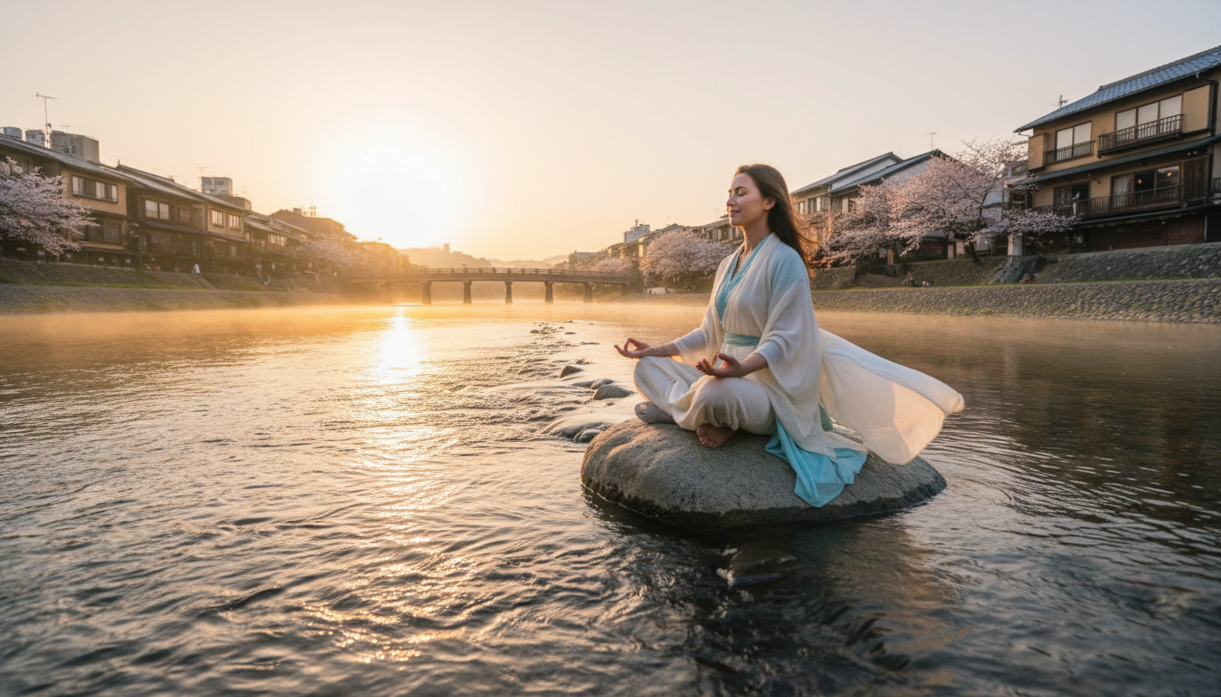 毎朝、美咲は鴨川のほとりで瞑想の時間を持つ。川の流れを見つめながら、今日一日を天に委ねる祈りを捧げる。水は今日も変わらず流れ続けている。急ぐこともなく、止まることもなく、ただ自然の法則に従って海へと向かっている。